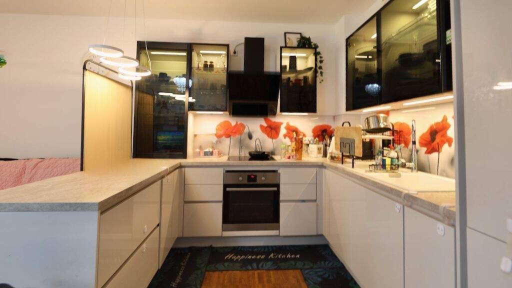 Auf ca. 109,86 m² verteilen sich ein Eingangsbereich; ein großer Wohn-/Essbereich mit offener Küche, ausgestattet mit einer modernen Einbauküche; ein Badezimmer mit bodentiefer Dusche, welches sich auch als Gäste-WC eignet; ein praktischer Hauswirtschaftsraum sowie drei Schlafzimmer, wobei eines davon über ein tagesbelichtetes Bad en-suite mit Badewanne verfügt.