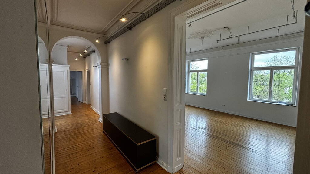 Bereits beim Betreten der Wohnung fällt der edle Echtholz-Dielenboden ins Auge, der in Kombination mit den kunstvollen Stuckdecken und den hohen Decken eine einzigartige, elegante Atmosphäre schafft. Große, doppeltverglaste Fenster sorgen in allen Räumen für viel Tageslicht und ein helles, freundliches Wohngefühl.