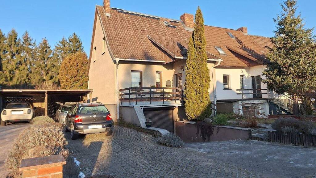 Es verfügt im Erdgeschoss über ein sehr großes Wohn-/ Esszimmer mit Zugang zur großen Sonnenterrasse in Süd-West-Ausrichtung, eine Küche, ein Gäste-WC, einen Windfang sowie einen geräumigen Flur. Von diesem gelangt man in das Dachgeschoss. Dieses umfasst drei Wohn-/ Schlafzimmer, ein Wannenbad mit Fenster sowie einen kleinen Flur. Im Kellergeschoss sind zwei weitere Wohn-/ Schlafzimmer, eine Waschküche mit WC und Dusche, ein Heiz- / Abstellraum, ein Flur sowie eine geräumige Garage mit elektrischem Tor angeordnet.