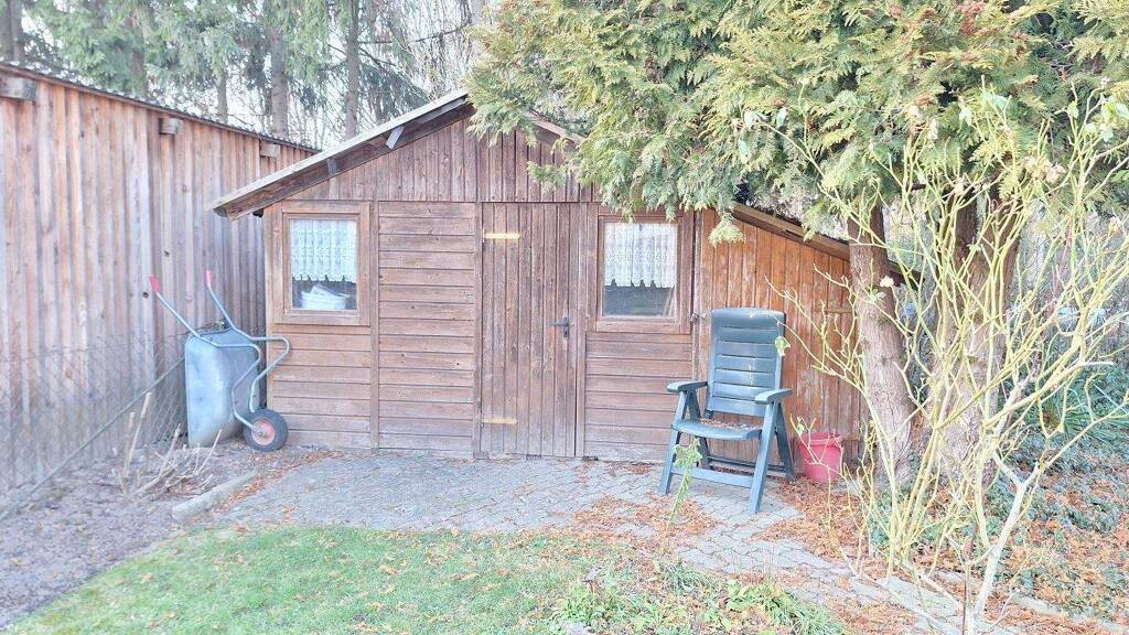 Das begrünte Grundstück umfasst eine Auffahrt mit einer PKW-Stellfläche sowie einen Geräteschuppen. Eine angrenzende Grundstücksfläche mit einer Größe von 243 m² kann dazugepachtet werden - aktueller Pachtzins ca. 486 € p.a.. Auf diesem ist ein Carport mit weiteren Stellplätzen vorhanden.