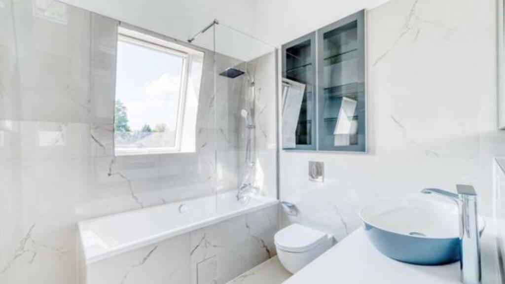 Das Obergeschoss bietet wegen des Mansardendachs kubische Zimmerdimensionen ohne Dachschrägen. Zum feinen Ambiente tragen auch auf dieser Etage klassische Kassettentüren und massive Holzdielenböden bei. Sehr ästhetisch ist das mit Marmorfliesen, einer Waschschale, Wanne und anderen edlen Sanitärelementen ausgestattete Badezimmer.