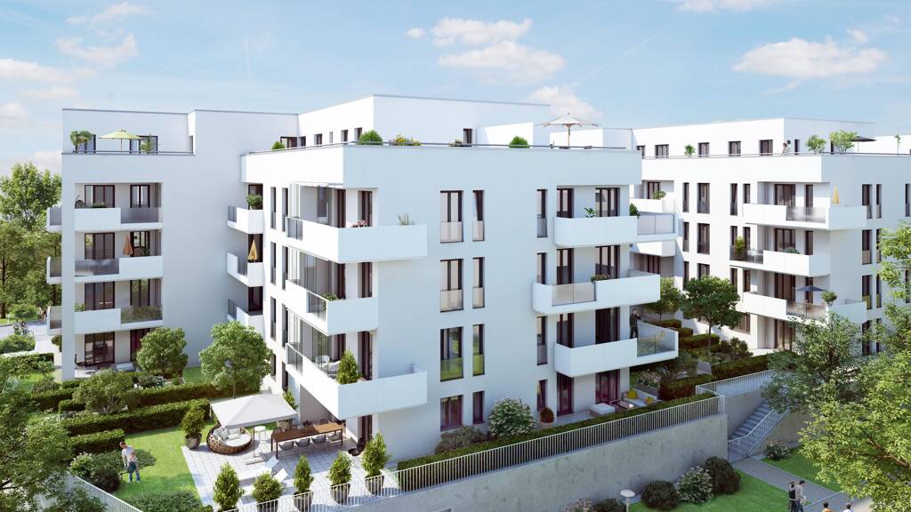 "Alle Wohnungen erhalten entweder Gartenanteile, Balkone, Terrassen oder Dachterrassen, die zu den ruhigen und großzügigen Grünflächen ausgerichtet