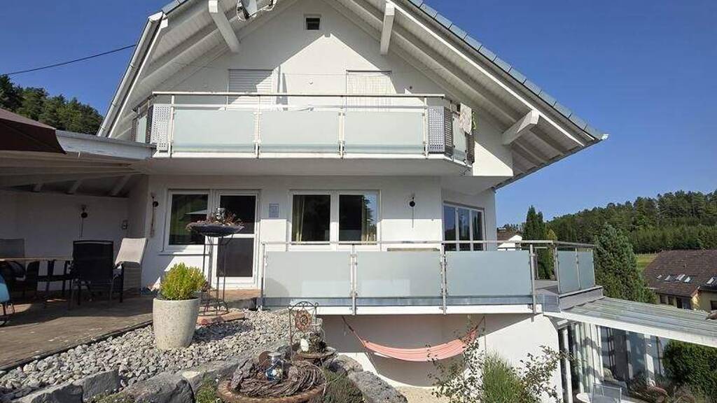 Diese wunderschöne Immobilie ist "der Traum" für Menschen, welche Ruhe suchen, die Natur,- und den Garten lieben und in guter Atmosphäre wohnen wollen. In schönem Ambiente empfangen Sie Ihre Gäste im Eingangsgeschoss und kommen über die Treppe direkt in die stilvolle Wohnetage. Hell und freundlich präsentiert sich der offene Wohnbereich mit herrlichem Blick übers Tal in die Natur und dem eigenen Garten. Die Küche mit separater Speisekammer ist gut geschnitten und trennt Sie nur durch einen Tresen vom Esszimmerbereich, so können Sie sich auch als kochender Gastgeber stets mit Ihren Freunden und Bekannten unterhalten. Zugang in den traumhaften Garten hat man über den Balkon über das Wohnzimmer oder direkt über die Terrasse vom Essbereich. Ein Büro sowie das Gäste-WC runden diese Etage ab. Die drei gut dimensionierten Schlafräume befinden sich im Dachgeschoss. Sehr durchdacht ist das 2022 neu renovierte Bad mit hochwertigen Fließen. Neben dem Eingangsbereich im Untergeschoss liegt derzeit das Gästezimmer mit angrenzendem Badezimmer und WC. Des Weiteren sind auf dieser Etage der Heizraum, der Natursteinkeller, die Werkstatt und die große Doppelgarage, wo Sie Ihre Fahrzeuge sicher und trocken unterstellen können.