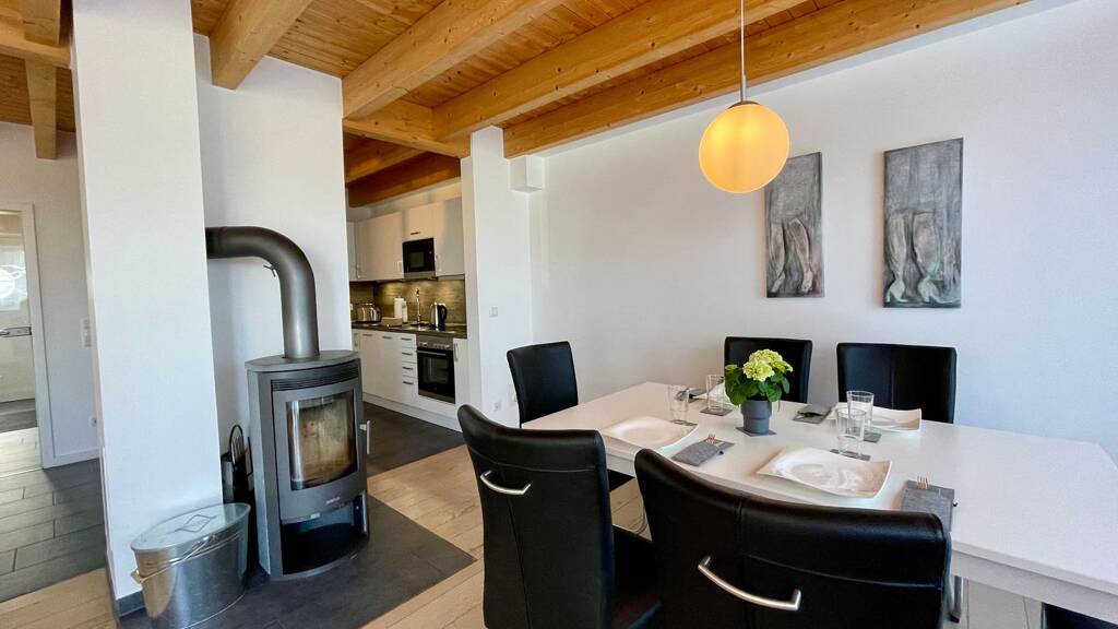 * 1 Schlafzimmer * Bad mit Dusche, WC, Waschbecken u. Fenster * offener Wohnbereich mit Esstisch und moderner Einbauküche * Kamin * bodentiefe Fenster zur Terrasse * Terrasse mit Blick auf den Hafen / Wasserblick * 1 Abstellraum, innen