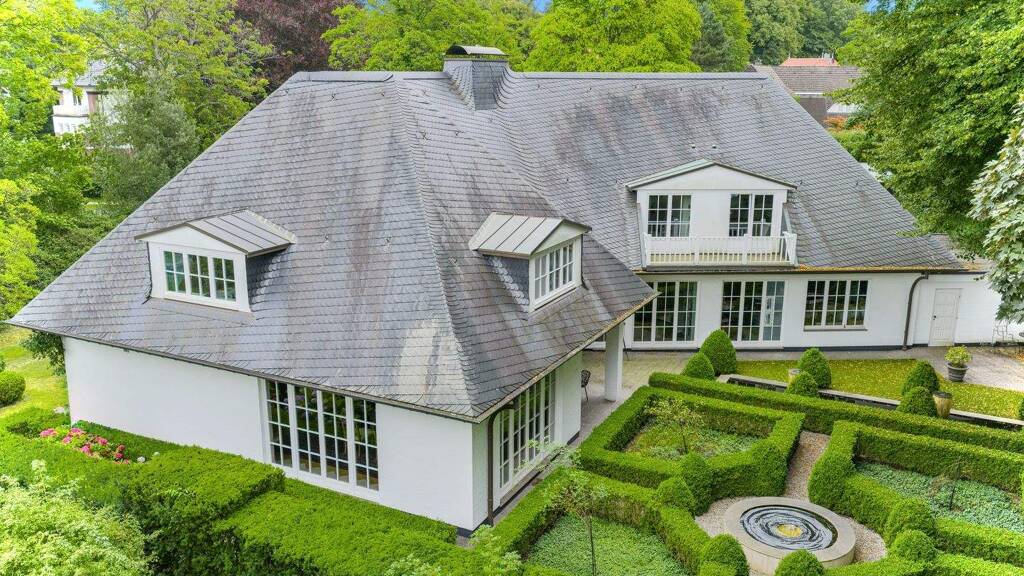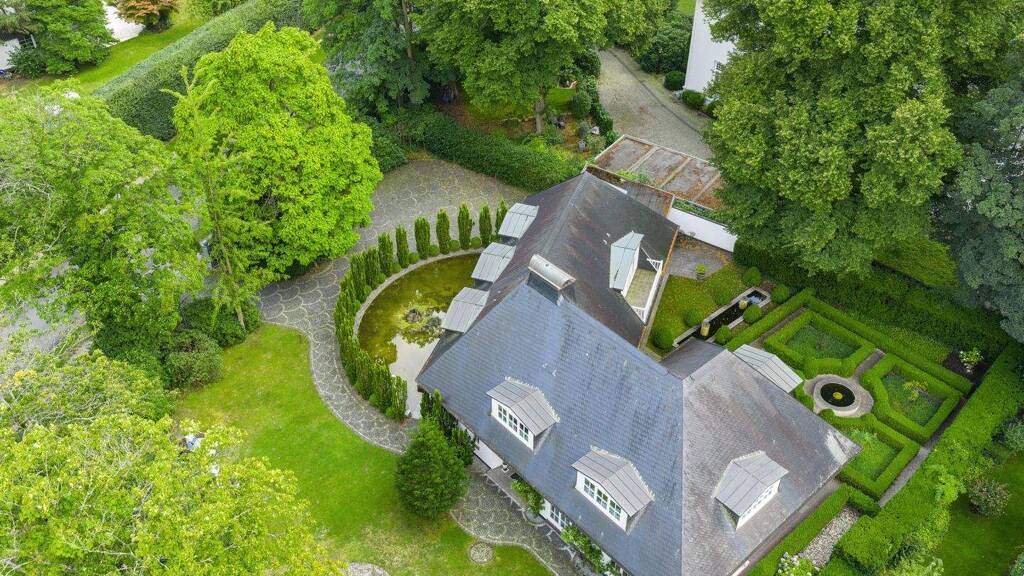 Die Villa wurde ca. 1960 / 61 im Landhausstil erbaut und ab 1999 laufend modernisiert. Das Dach wurde mit Schiefer gedeckt und von einem Europameister und einem deutschen Meister im Dachdeckerhandwerk geplant und ausgeführt, hochwertige Holzfenster wurden von der Firma Korn erneuert, die Bodenbeläge im Eingangsbereich mit Granit neu verlegt. Das Haus empfängt den Besucher mit einer großen Eingangshalle mit Galerie an welches ein Gäste- WC anschließt. Übergehend in die moderne Einbauküche, die sich zum hellen Esszimmer mit bodentiefen Fenstern öffnet.