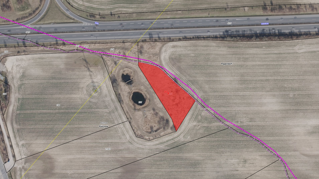 Das Grundstück befindet sich auf der Südseite der Autobahnanschluss-Stelle "A20 Abfahrt Rostock-Süd", in direkter Verlängerung der Parkplätze für Mitfahrgelegenheiten.