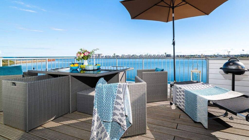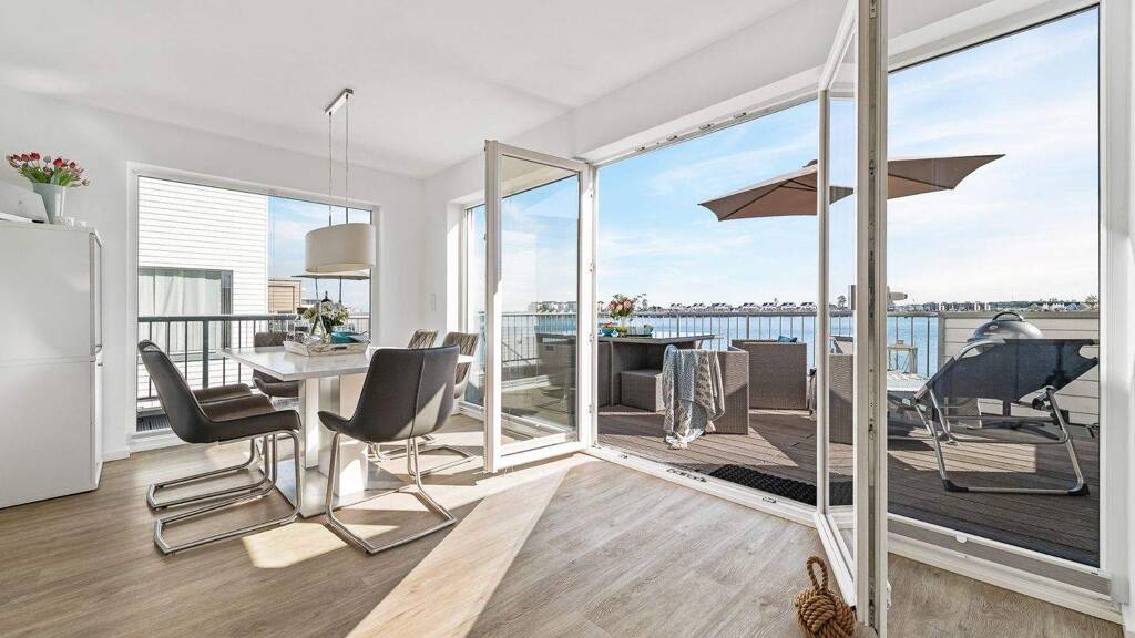 Diese moderne Maisonettewohnung vereint maritimes Flair, stilvolles Design und höchsten Wohnkomfort auf ca. 97 m² Wohnfläche. Mit drei großzügig geschnittenen Zimmern bietet sie den idealen Rückzugsort für alle, die Erholung und Meeresnähe zu schätzen wissen. Eingebettet in das idyllische OstseeResort Olpenitz genießen Sie hier die einzigartige Kombination aus maritimer Atmosphäre und exklusivem Wohngefühl - nur wenige Gehminuten vom privaten Strand des Resorts entfernt. In der unteren Etage erwartet Sie rückwärtig die voll ausgestattete, moderne Küche mit Essbereich. Bodentiefe Fenster sorgen für einen lichtdurchfluteten Raum. Von hier aus gelangen Sie auf den großzügigen Balkon, der mit einem atemberaubenden Blick auf das Hafenbecken begeistert - der perfekte Ort, um den Tag bei einem Glas Wein ausklingen zu lassen. Auf der gegenüberliegenden Seite der Etage befindet sich der behagliche Wohnbereich. Auch hier sorgen bodentiefe Fenster für fantastische Ausblicke - dieses Mal auf die idyllische Schlei. An kühleren Tagen verleiht der Kaminofen dem Raum eine besonders gemütliche Atmosphäre. Ein modernes, innenliegendes Duschbad rundet das Raumangebot dieser Ebene ab. Die obere Etage beherbergt zwei komfortable Schlafzimmer - eines mit Blick auf das Hafenbecken, das andere mit Blick auf die Schlei. Ein echtes Highlight ist das elegante Vollbad mit Whirlwanne und Infrarot-Wärmekabine - Ihr ganz persönlicher Wellnessbereich, der pure Entspannung verspricht. Zusätzlich punktet die Wohnung mit einem Stellplatz für Ihr Fahrzeug direkt vor der Tür. Von hier aus erreichen Sie auch bequem die zahlreichen Freizeitmöglichkeiten im Resort, wie zum Beispiel den Yachthafen oder den Strand. Die Wohnung befindet sich in der Ferienvermietung und wird inklusive Inventar verkauft. Im Kaufvertrag kann auf Wunsch ein Kaufpreis für das Inventar separat ausgewiesen werden. Lassen Sie sich diese Gelegenheit nicht entgehen und vereinbaren Sie noch heute einen Besichtigungstermin für diese einzigartige Maisonettewohnung im OstseeResort Olpenitz!