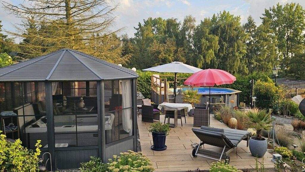 Willkommen in Ihrem Traumhaus in Wismar-Redentin! Dieses Anwesen verfügt über ein Einfamilienhaus welches 2021 mit einem neuen Reetdach versehen wurde und über ein Nebengebäude. Beide stehen auf einem großzügigen Grundstück von ca. 1.385 m². Das im Jahr 1986 erbaute und in 2020 saniert und aufwendig umgebaute, gepflegte Anwesen bietet Ihnen eine ideale Kombination aus Wohnkomfort und Freiraum. Das Haupthaus erstreckt sich über drei Etagen und bietet ca. 170 m² Wohnfläche. Es umfasst fünf geräumige Zimmer, darunter zwei Schlafzimmer und zwei Bäder sowie ein zusätzliches Gäste-WC. In der geschmackvoll gestalteten Einbauküche und dem einladenden Wohn-, Esszimmer mit Elektrokamin lassen sich gemütliche Stunden verbringen. Drei Panorama-Terrassen bieten Ihnen den perfekten Ort, um die malerische Umgebung zu genießen. Das Nebengebäude ergänzt das Anwesen mit weiteren ca. 110 m² Wohnfläche, aufgeteilt in drei Zimmer, darunter ein Schlafzimmer und ein Badezimmer sowie ein Gäste-WC, sowie ein eingerichteter Fitnessraum. Sowohl im Haupthaus als auch im Nebengebäude sorgen hochwertige Bodenbeläge aus Fliesen, Parkett und Laminat für ein stilvolles Ambiente. Zusätzlich erwarten Sie im Außenbereich luxuriöse Extras wie ein Swimmingpool, ein Jacuzzi im Pavillon und eine Sauna (Keller), die Entspannung und Erholung garantieren auch zwei Grillstellen. Den energetischen Herausforderungen der Zeit kommt diese Immobilie mit zwei Photovoltaikflächen, eine auf dem Nebengebäude und eine weitere auf dem Carport nach. Gespeichert wird der produzierte Strom in dem eigenem Energiespeicher mit 30Kw.