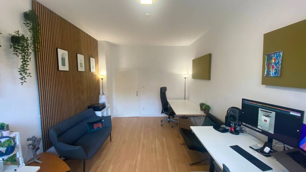 Der große Raum ist unmöbliert und eignet sich für 2-3 Personen. Ein höhenverstellbarer Schreibtisch und ein Bürostuhl können bei Bedarf vom Vormieter übernommen werden.