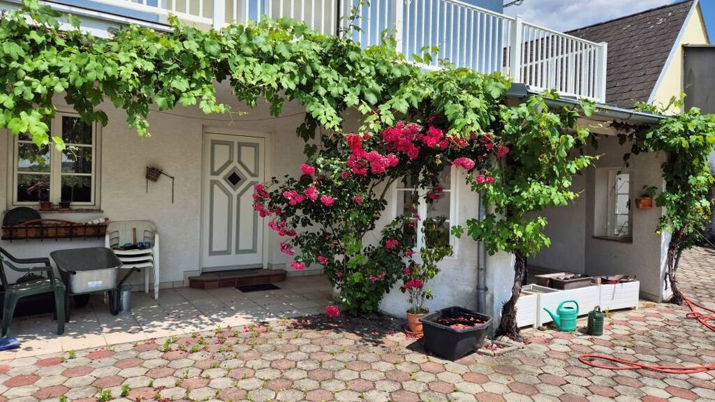 Das gepflegte Grundstück besticht durch einen wunderbar angelegten Garten, der zum Spielen und Entspannen einlädt. Der Außenbereich ist mit einem stilvollen Pflaster gestaltet und bietet eine überdachte Veranda, die mit Weinreben geschmückt ist - der perfekte Ort für laue Sommerabende oder gesellige Zusammenkünfte mit Familie und Freunden. Ein Einfahrtstor sorgt für eine angenehme Privatsphäre und Sicherheit.