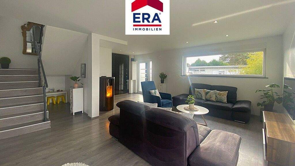 Im EG befinden sich der Wohn-, Essbereich mit Pelletofen und direktem Zugang zur Terrasse mit Garten, die offene Küche mit Sitztheke, ein separates WC mit Waschbecken sowie der Zugang zur Waschküche und Garage für einen PKW.