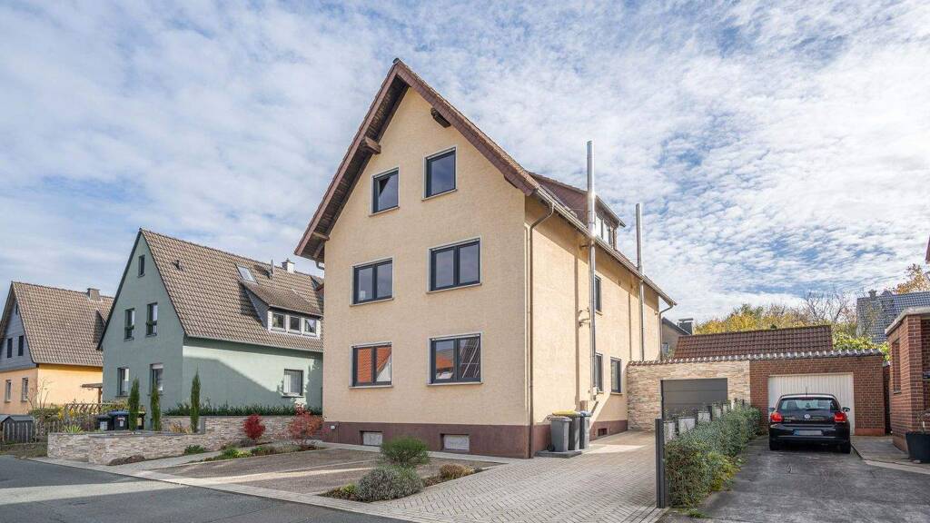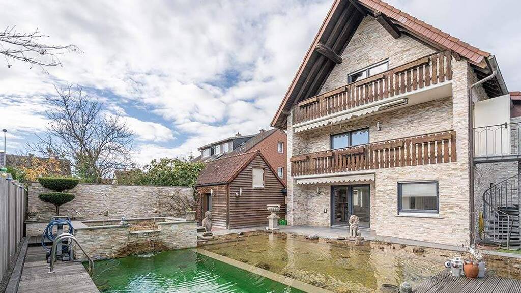 Hier präsentiert sich ein charmantes Zweifamilienhaus, das klassische Architektur mit modernem Wohnkomfort vereint. Das im Jahr 1956 errichtete Gebäude wurde 1979/1980 erweitert und 2011/2012 umfassend saniert. Durch fortlaufende Modernisierungen so wie zuletzt in den Jahren 2022 bis 2025 befindet sich die Immobilie heute in einem gepflegten Zustand. Die beiden Wohneinheiten überzeugen unter anderem durch großzügige Grundrisse, hochwertige Einbauküchen und elektrische Jalousien. Die Natursteinfassade sowie stilvolle Details wie ein Holz- und ein Specksteinofen schaffen ein harmonisches und wohnliches Gesamtbild. Beide Etagen verfügen über einen Balkon, das Erdgeschoss zusätzlich über eine Terrasse mit Blick in den Garten. Das Dachgeschoss zeigt sich im ursprünglichen Stil mit Vertäfelung; das dortige Badezimmer bedarf einer Sanierung – eine ideale Gelegenheit, um individuelle Gestaltungswünsche umzusetzen. Das Haus ist vollständig unterkellert und bietet neben einer Garage mit angrenzendem Schuppen insgesamt vier PKW-Stellplätze sowie ein separates Gartenhaus. Der liebevoll angelegte Garten mit Schwimmteich vermittelt Urlaubsatmosphäre und lädt zum Entspannen ein – ein echtes Highlight dieser besonderen Immobilie.