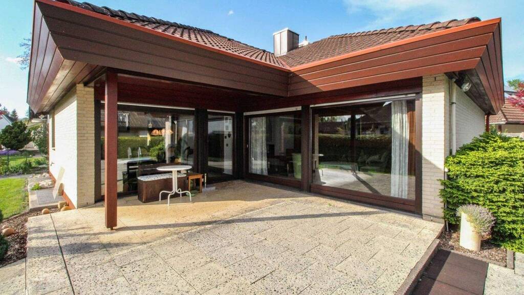 Das Haus bietet ca. 150?m² Wohnfläche (ca. 450?m² Gesamtfläche) und überzeugt mit einer durchdachten Aufteilung: Drei gut geschnittene Schlafzimmer sind klar vom großzügigen Wohnbereich getrennt, was eine ruhige und funktionale Raumstruktur schafft. Der offene Wohn- und Essbereich mit Kamin und großen Fensterfronten sorgt für viel Licht und einen direkten Zugang zur Terrasse und dem Garten.