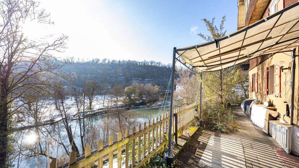 Direkt vom Wohnbereich gelangen Sie auf die sonnige Südwest-Terrasse. Von hier genießen Sie einen uneingeschränkten Blick auf die historische Burg von Schwäbisch Hall - begleitet vom sanften Fließen des Kocher, der sich unmittelbar vor dem Haus erstreckt und ein besonders idyllisches Ambiente schafft. Ob ein entspanntes Glas Wein an einem lauen Sommerabend oder ein geselliges Familienfest - hier finden Sie den perfekten Ort, um besondere Momente zu genießen.