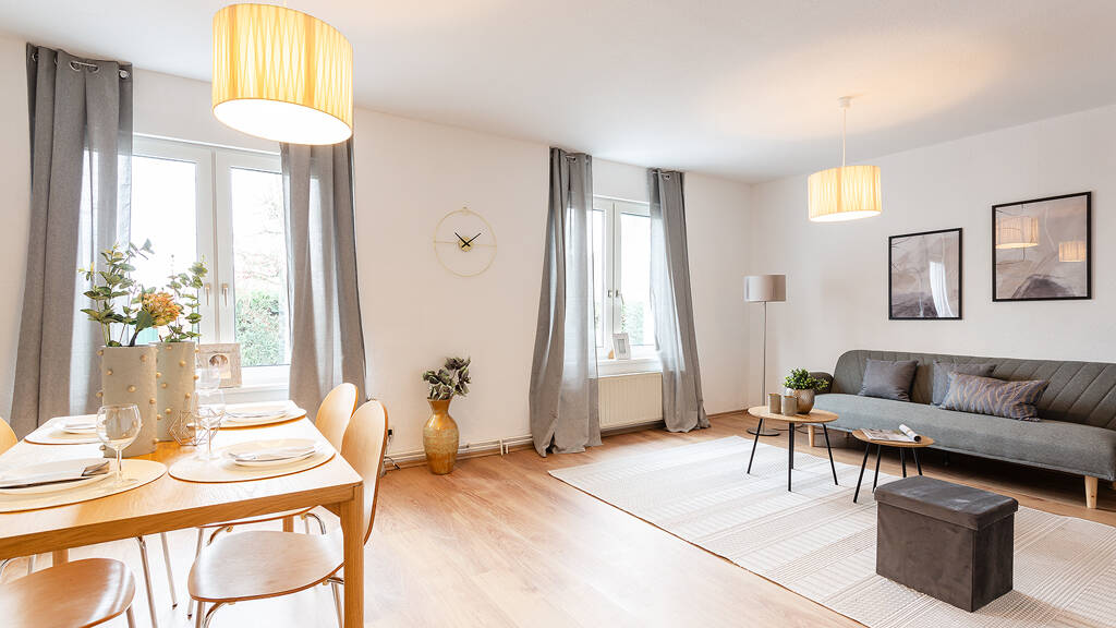 Im Erdgeschoss betreten Sie zunächst einen lichtdurchfluteten Wohnbereich, der durch große Fenster eine angenehme Atmosphäre bietet. Hier finden sich zwei einladende Wohnräume, die sowohl zum Entspannen als auch zum geselligen Beisammensein einladen. Angrenzend befindet sich die moderne, 2023 erneuerte Einbauküche, die mit hochwertigen Geräten ausgestattet ist und genügend Platz für eine gemütliche Essecke bietet. Zudem finden Sie im Erdgeschoss ein großzügiges Tageslicht-Vollbad, das 2005 modernisiert wurde. Das Badezimmer ist mit einer zusätzlichen Dusche ausgestattet und bietet somit einen hohen Komfort.