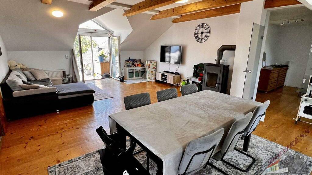 Das lichtdurchflutete Obergeschoss mit ca. 147 m² Wohnfläche versprüht durch seine Dachschrägen und die rustikalen Holzbalken an der Decke einen unvergleichlichen Charme. Über den Stiegenaufgang gelangen Sie in den Vorraum mit Zugang zu 3 zentral begehbaren Schlafzimmern und der vollausgestatteten Einbauküche. Vom riesigen Wohnzimmer mit dem durch eine Glaswand abgetrenntem Büro/Fitnessraum mit einem weiteren angeschlossenen Zimmer eröffnet sich Ihnen der ca. 14m² große Sonnenbalkon mit Blick auf den topgepflegten Garten mit u.a. Äpfel- und Zwetschgenbäumen, Wiesen und Feldern - einfach perfekt für die nahende Chill- und Grill-Saison. Ebenfalls im Dachgeschoss befinden sich zudem 2 Badezimmer, ein separates WC und 2 Abstellräume. Die zum großen Teil 3-fach verglasten Kunststofffenster verfügen zum Teil über Fliegenschutz und Sonnenschutz und bieten entsprechend zeitgemäßen Komfort.