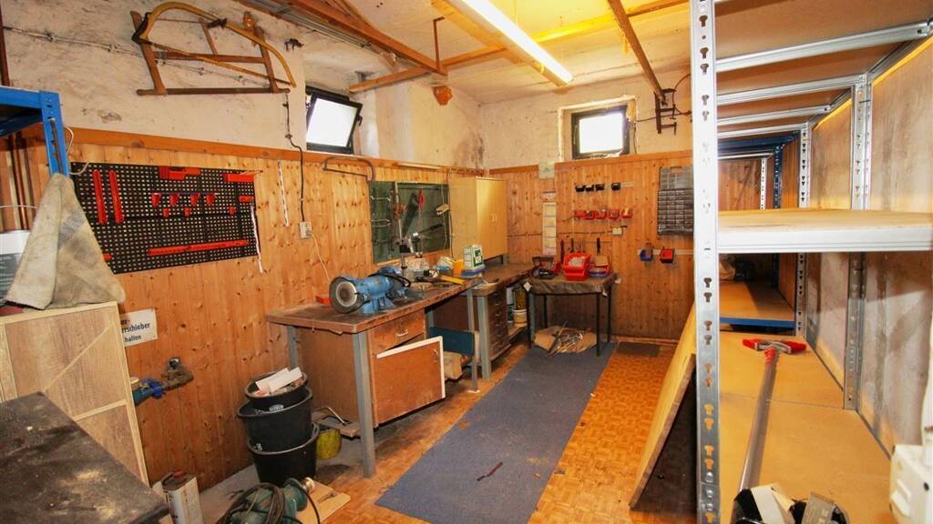 Der Kellerbereich beherbergt die Haustechnik und bietet mit zwei Werkstatträumen und einem Lagerraum zusätzlichen Stauraum für Hobby oder Handwerk. Direkt vor dem Haus befindet sich eine Garage, die ebenfalls zum Objekt gehört.
