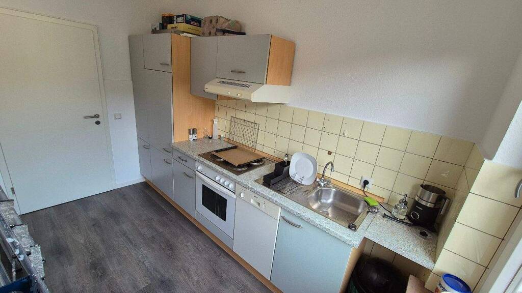 - Küche mit Kühlschrank, Herd, Backofen und Spülmaschine