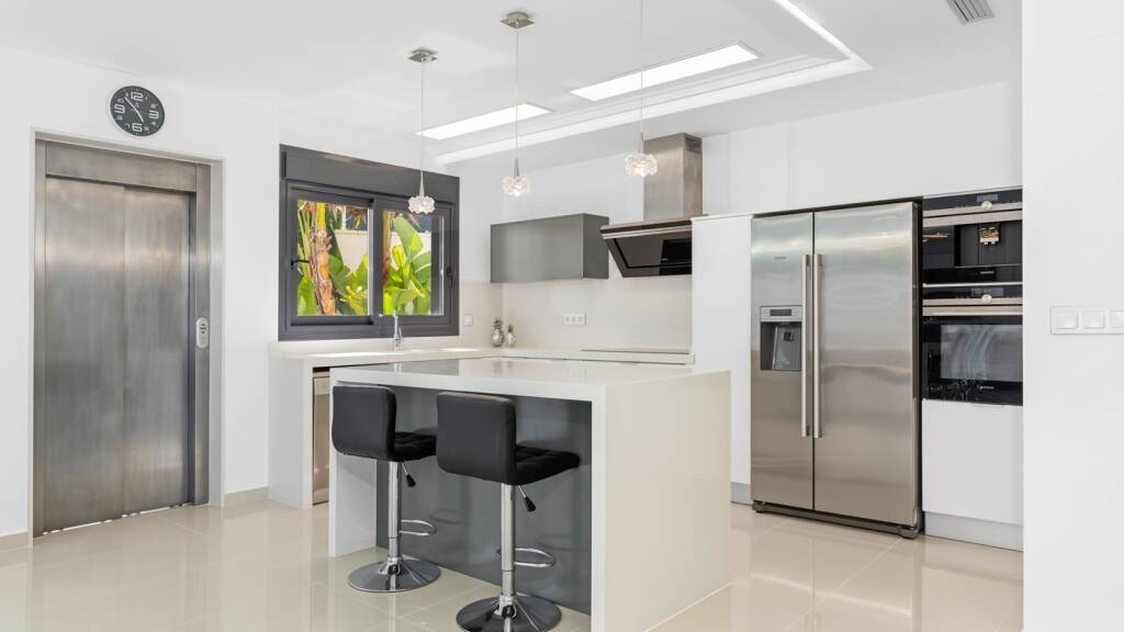 Dieses kürzlich erbaute Luxusanwesen verfügt über insgesamt 5 Schlafzimmer und 4 Badezimmer, verteilt auf zwei Etagen und einen Keller, mit einem praktischen Aufzug, der mit allen Etagen des Hauses kommuniziert, und einer schönen Glastreppe mit Innenbeleuchtung. Im Keller finden wir ein Spielzimmer (mit Billard und Tischfußball), einen Raum für Feiern mit voll ausgestatteter Küche, 2 Schlafzimmer, 2 Abstellräume und ein komplettes Badezimmer. Im Erdgeschoss finden wir das Wohn-Esszimmer mit offener Küche und zentraler Insel, das Hauptschlafzimmer mit eigenem Bad sowie eine Waschküche und eine Toilette. Im ersten Stock befinden sich 2 geräumige Schlafzimmer, 2 Badezimmer und Zugang zu den Balkonen. In der obersten Etage finden wir ein unglaubliches 70 m² großes Solarium mit beeindruckendem Panoramablick.