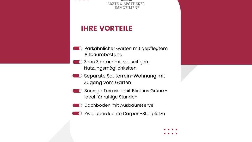 Abgerundet wird das Angebot durch zwei Carport-Stellplätze und eine mögliche Ausbaureserve im Dachboden, die zusätzlichen Raum für individuelle Ideen bietet.