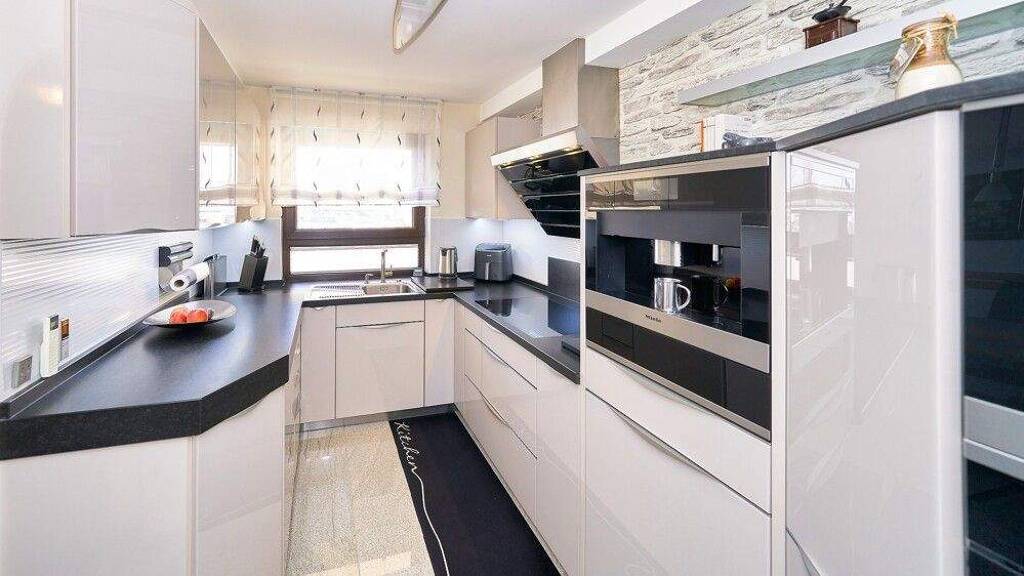 Die moderne Einbauküche ist im Kaufpreis enthalten und mit hochwertigen Markengeräten (Miele, Spülmaschine Bosch) ausgestattet. Ein integrierter Abstellbereich bietet zusätzlichen Stauraum.
