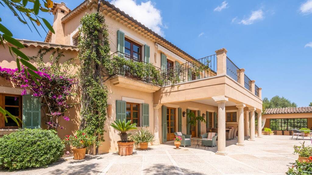 This residence features five bedrooms and four bathrooms, providing ample space for family and guests. Two bedrooms with private restrooms are located on the ground floor. They provide a shared kitchenette and a TV lounge with access to a terrace. There are three additional bedrooms on the first floor. The master suite provides access to two terraces with breathtaking vistas. The expansive 53,600-square-meter plot guarantees seclusion and tranquilly, creating an oasis of peace in the Mallorcan countryside.
