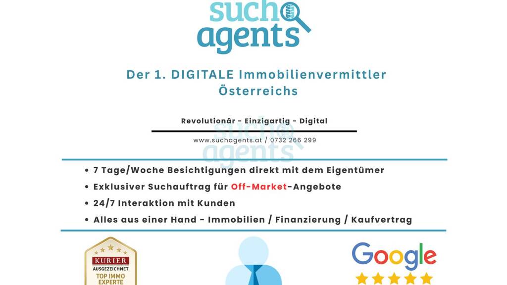 SuchAgents vermittelt digital und stellt Kontakt sowie Unterlagen bereit; Besichtigungen erfolgen direkt mit den Eigentümer. Bei Vertragsabschluss berechnen wir eine Provision von 2 % des Kaufpreises zzgl. MwSt., bei Besichtigungen durch unseren Berater 3 % zzgl. MwSt.