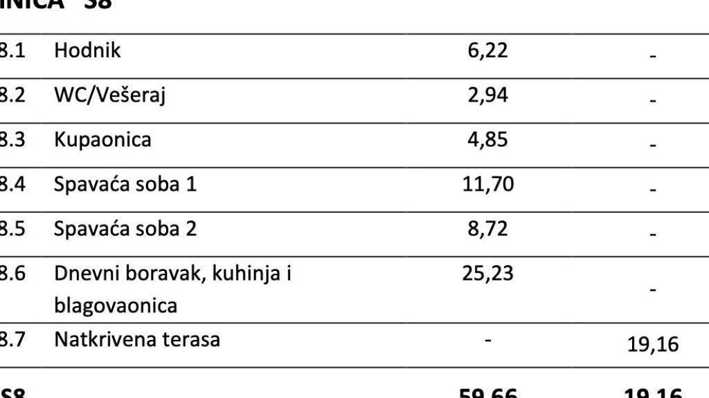 Die Wohnung S8 ist ein Penthouse und befindet sich im 2. Stock eines Wohngebäudes mit Aufzug. Sie ist nach Süden ausgerichtet. Die Innenwohnfläche beträgt 59,66 m2 und besteht aus 2 Schlafzimmern, einem offenen Wohnbereich mit Küche und Esszimmer, 2 Badezimmern mit WC, Abstellraum, Eingangsflur sowie einer überdachten Terrasse mit einer Grundfläche von 19,16 m2. Zur Wohnung gehört außerdem ein Außenstellplatz. Die gesamte berechnete / verkaufsfähige Wohnfläche beträgt 78,82 m2.