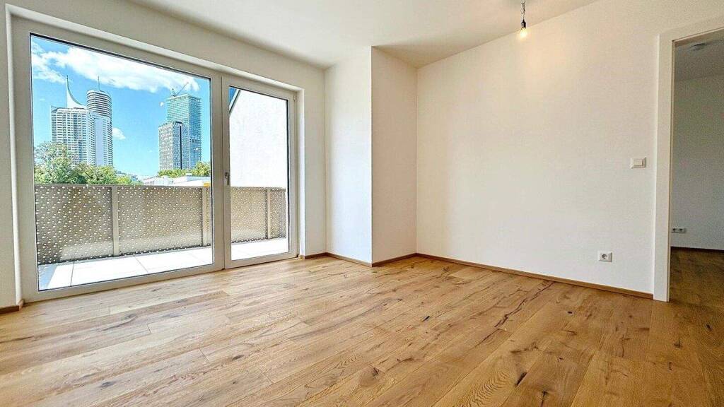 Der Wohnbereich beeindruckt durch seine großzügige Raumgestaltung und den direkten Zugang zur großen Terrasse, die einen beeindruckenden Blick auf die Donau-City und die Skyline Wiens bietet.