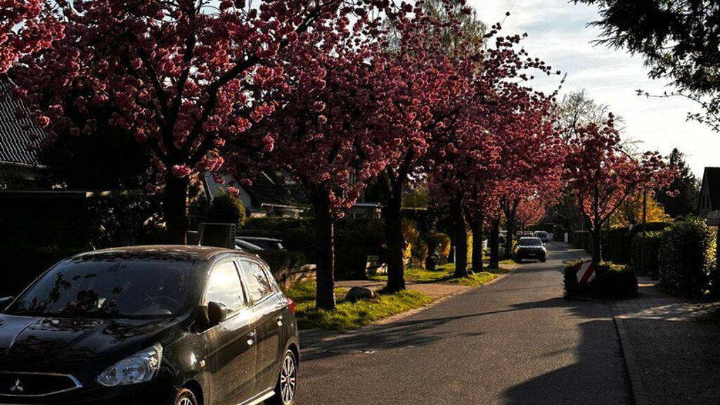 Ruhige Wohnlage im Herzen von Poppenbüttel, geprägt von gepflegten Einfamilienhäusern und einer idyllischen Straße mit blühenden Kirschbäumen im Frühjahr.
