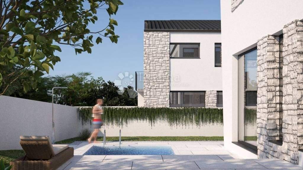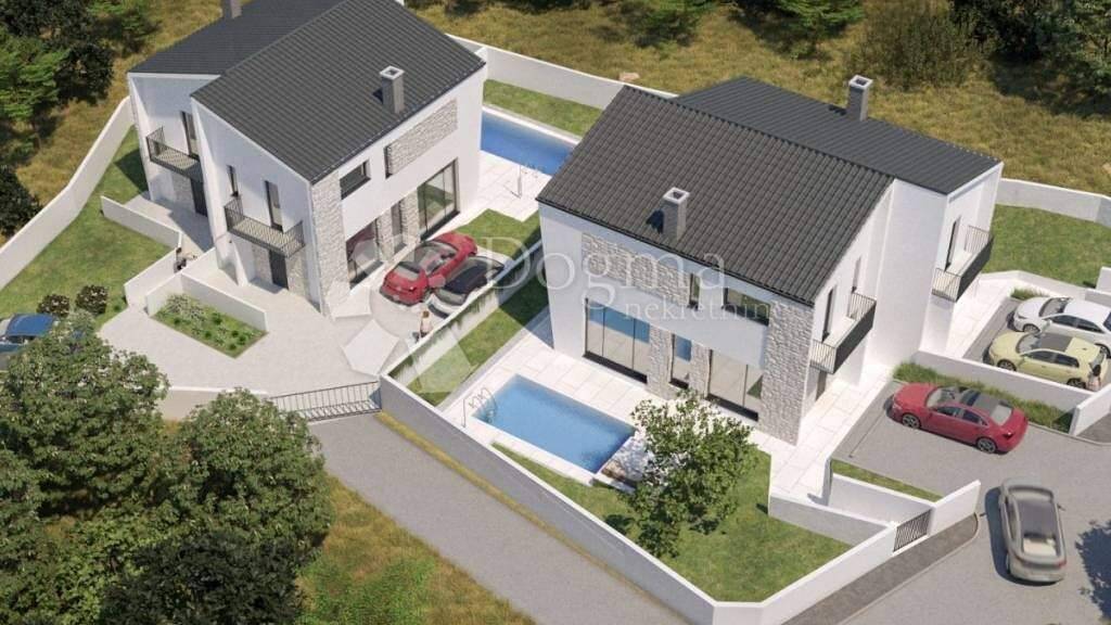 In bester Lage, die Ruhe und Privatsphäre bietet, steht eine luxuriöse Doppelhaushälfte im Bau zum Verkauf, die nach modernen istrischen Architekturkonzepten errichtet wird. Sie können die Villa als eigenständige Einheit oder als angebaute Hälfte erwerben. Sie ist eine ideale Oase der Ruhe inmitten atemberaubender Natur. Alles, was Sie benötigen, ist in unmittelbarer Nähe, und dennoch fühlt es sich an, als läge man mitten in der Wildnis. Erstklassige Materialien und eine hochwertige Bauweise machen diese Luxusimmobilie zu einem besonderen Erlebnis. Jede Villa verfügt über drei Schlafzimmer, jeweils mit eigenem Bad im Obergeschoss. Ein System aus Glas-ALU-Wänden mit bodentiefen Fenstern im Erdgeschoss verbindet das Wohnzimmer mit der Sonnenterrasse und dem 21 m großen Swimmingpool. Eine außergewöhnliche Lösung für ein großzügiges Raumgefühl und um die ersten Sonnenstrahlen des Morgens zu genießen. Die elegante Deckengestaltung und -höhe zeigen sich im Bereich des Kamins, der Wohnzimmer und Küche harmonisch miteinander verbindet. Holz, Stein und Beton sind harmonisch in die Architektur der Villa integriert. Das gesamte Anwesen bietet Meerblick. Der Stil ist modern, aber mediterran. Jede Villa verfügt über zwei Parkplätze und ist über eine asphaltierte Straße erreichbar. Der Käufer begleitet alle Bauphasen. Eine ideale Gelegenheit, ein Haus in guter Lage mit Anbindung an die Autobahn und alle istrischen Küstenstädte zu erwerben. Pula ist ca. 18 km, der Flughafen 15 km, Rovinj 40 km und Porec 60 km entfernt. Zur Ausstattung gehören unter anderem: Klimaanlage mit Inverter-Split-System, Möblierung (ähnlich den Bildern), Kamin, Einbauküche mit Geräten, Garten und vieles mehr.