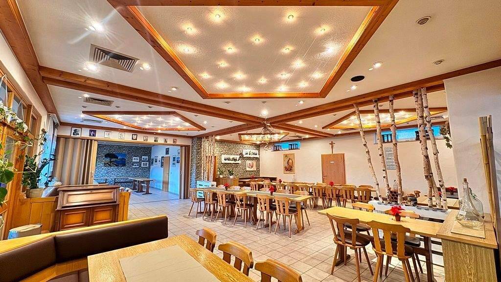 Helle und freundliche Ausstattung, pflegeleichte Fliesenböden. 2018/19 wurde die Küche modernisiert und neu eingerichtet, die Gasträume gestrichen. Zudem: abgehängte Decken mit Einbauspotts, Öl-Zentralheizung, weiße Kunststofffenster mit Rollläden, Toiletten entsprechen heutigen Standards. Theke und Mobiliar sind im Eigentum des Sportvereins und werden mitverpachtet. Das Sportheim ist derzeit brauereifrei.