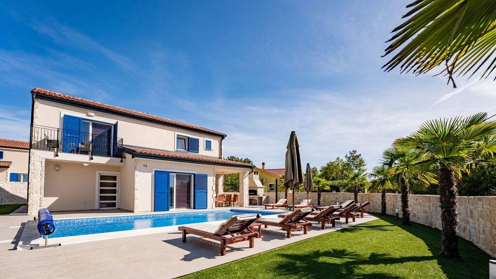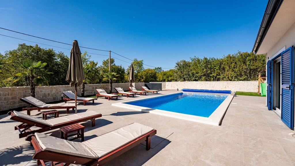 In ruhiger Lage in der Nähe von Dobrinj, nur 5 km vom Meer entfernt, befindet sich eine moderne Luxusvilla, die Komfort, Privatsphäre und elegantes Design vereint. Die Villa erstreckt sich über zwei Etagen mit insgesamt ca. 185 m² Wohnfläche. Der sorgfältig angelegte Garten mit Swimmingpool und Sonnenterrasse bietet einen idealen Ort zum Entspannen und Genießen. Im Erdgeschoss befindet sich ein geräumiges Wohnzimmer, verbunden mit Küche und Esszimmer, das auf eine überdachte Terrasse mit Blick auf Pool und Garten führt. Auf derselben Etage befinden sich ein Ankleidezimmer, eine Toilette und ein Schlafzimmer mit eigenem Bad. Im ersten Stock befinden sich drei weitere Schlafzimmer, jeweils mit eigenem Bad, ein überdachter Balkon zum Entspannen und eine praktische Waschküche. Das Äußere der Villa bietet die perfekte Balance zwischen Eleganz und Funktionalität - ein Swimmingpool mit Warmwasserbereitung über eine Wärmepumpe, eine Sonnenterrasse und ein Grill sowie ein Parkplatz für mehrere Fahrzeuge. Die Villa ist mit Fußbodenheizung, Klimaanlage, Alarmanlage und Videoüberwachung ausgestattet. Die Mehrwertsteuer ist im Preis inbegriffen, d. h. der Käufer zahlt keine Grundsteuer. Diese Villa stellt eine ideale Investition für einen Urlaub dar, aber auch für luxuriöses Wohnen das ganze Jahr über in einem der begehrtesten Teile der Insel Krk.