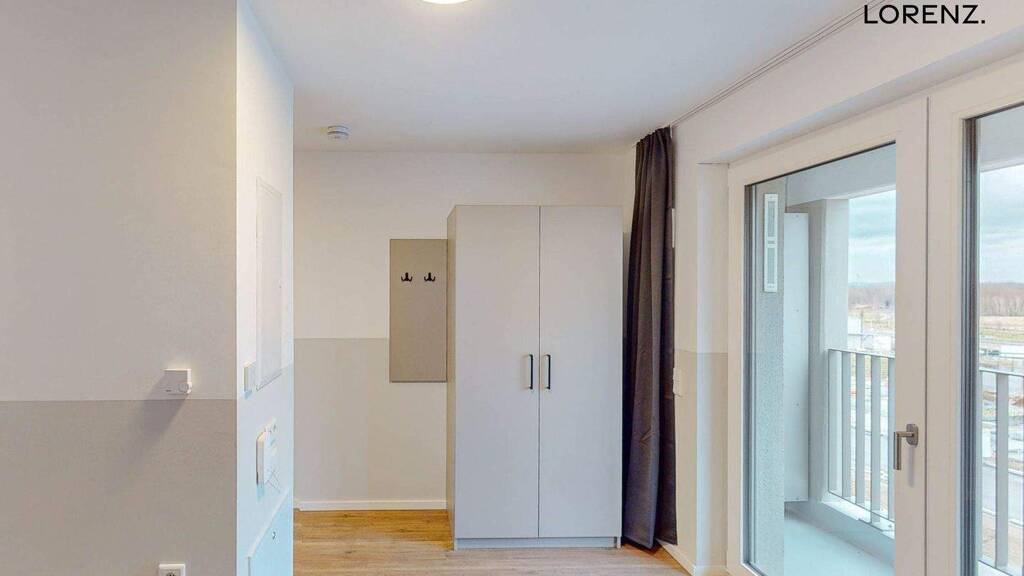 Toll geschnitten, mit praktischer Nische fürs Bett, lädt das große Wohnzimmer mit integriertem Kochbereich und schöner Loggia zum Relaxen ein. Ein schickes Badezimmer mit bodengleicher Dusche komplettiert das 1-Zimmer-Apartment. Ausgestattet ist das Apartment u.a. mit einem Bett, einem Schreibtisch, Kleiderschrank und Garderobenhaken.