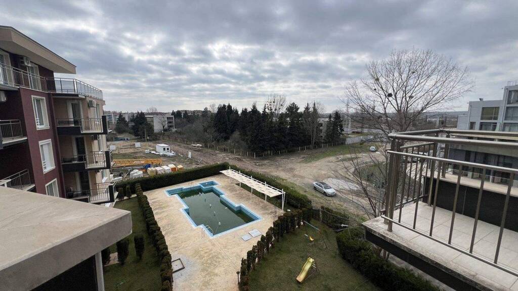 Vom Wohnbereich aus gelangen Sie auf den Balkon, der zum Entspannen einlädt und einen angenehmen Blick auf den Pool bietet - ideal für sonnige Tage an der Schwarzmeerküste.
