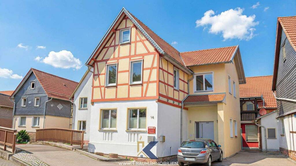 Das Gebäude selbst kombiniert massive Bauweise im Erdgeschoss mit traditionellem Fachwerk im Obergeschoss. Helle Räume, moderne Böden sowie verputzte und tapezierte Wandflächen schaffen eine angenehme Wohnatmosphäre. Kunststofffenster mit Isolierverglasung und die zentrale Gasheizung sorgen für zeitgemäße Funktionalität, während historische Elemente wie Holzbalkendecken den Charakter des Hauses bewahren. Das Dach ist als hölzernes Pfettendach ausgeführt und mit roten Tondachziegeln gedeckt, was den traditionellen Charme des Hauses unterstreicht.