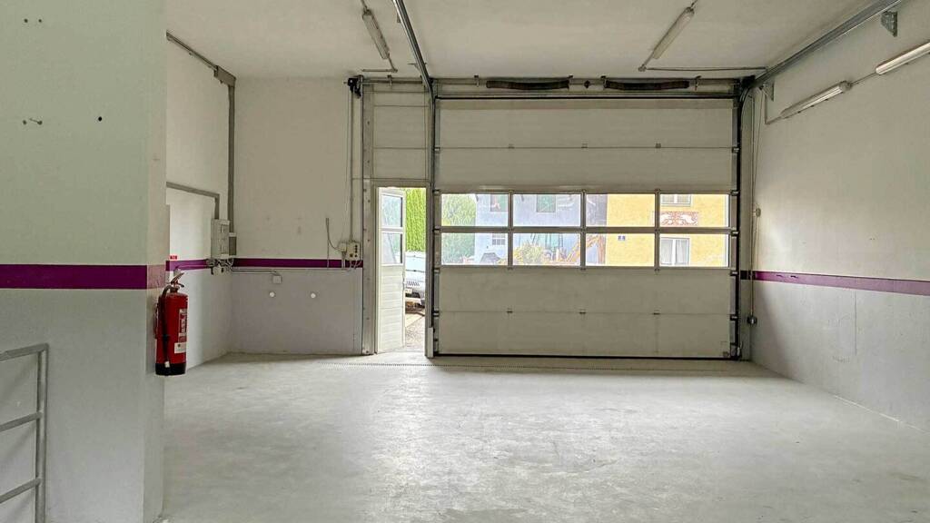 In Kombination mit der Bürofläche kann auch eine Lagerhalle/Garage um mtl. € 1.100,00 inkl. 20 % USt. angemietet werden. Nutzfläche ca. 81 m², ebenerdig befahrbar über ein großes Rolltor, Raumhöhe ca. 4 m. - Eine alleinige Anmietung der Halle ohne die Bürofläche ist nicht vorgesehen!