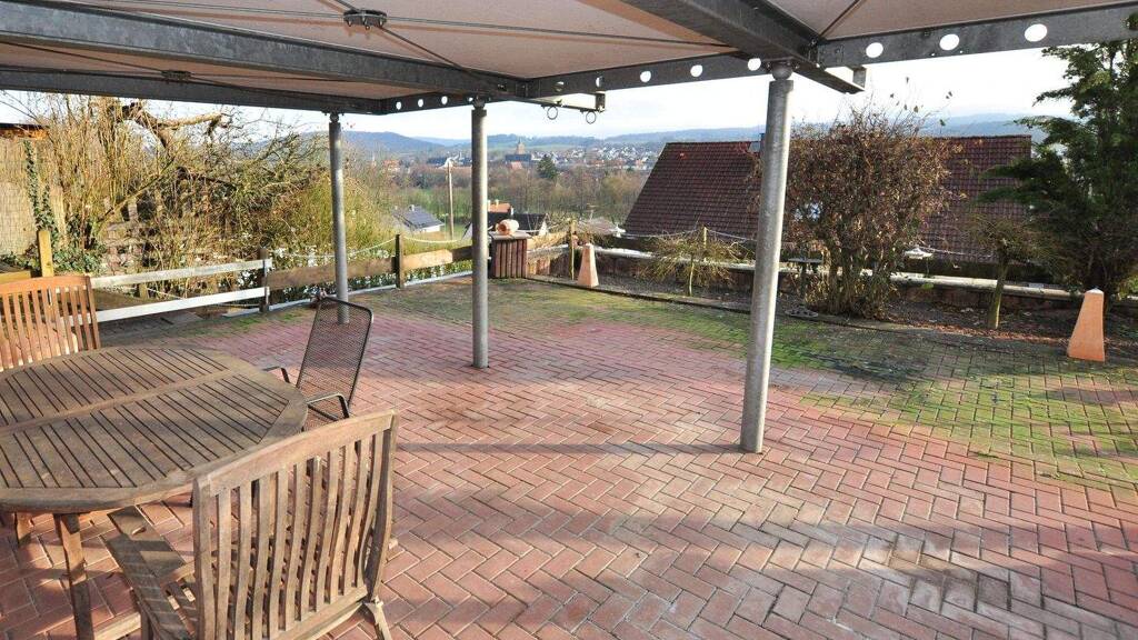 Der Garten ist überschaubar und pflegeleicht angelegt - ganz ohne Rasen, dafür mit sonnigem Südhang und herrlicher Aussicht. Auf der Terrasse mit überdachtem Sitzbereich lässt sich die Sonne den ganzen Tag genießen. Ein Nebengebäude bietet zusätzlichen Stauraum oder Platz für kreative Nutzungsideen.