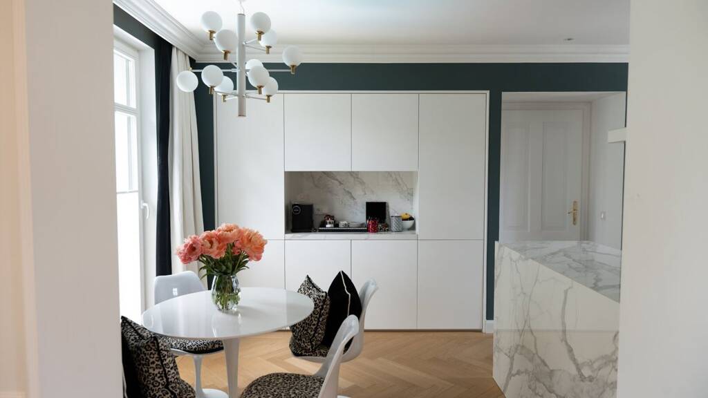 Weiters befindet sich im Erdgeschoss ebenso ein voll ausgestattetes GĂ€ste-Appartement, welches ebenfalls ĂŒber ein separates Badezimmer inkl. WC sowie edelste Marmorfliesen und Parkettböden verfĂŒgt.