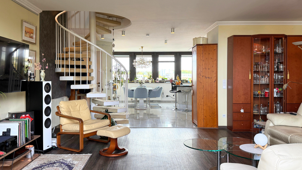Im Inneren bildet der offene Wohn-, Ess- und Kochbereich das Herz der Wohnung. Großzügig und klar strukturiert entsteht ein Raum, der verbindet und den Alltag leicht wirken lässt. Die Aufteilung über zwei Ebenen verleiht der Wohnung fast Stadthaus-Charakter: unten das Leben, oben der Rückzug. Ideal für Homeoffice, Atelier oder einen privaten Gästebereich.