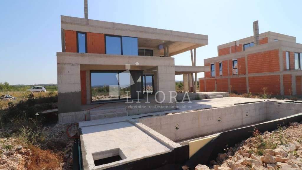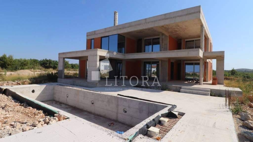 Vodice - eine exklusive Villa mit Panoramablick auf das Meer. Abseits des Stadttrubels bietet sie Ruhe und absolute Privatsphäre und schafft so eine perfekte Umgebung zum Entspannen und Genießen. Mit ihrer eleganten dreistöckigen Bauweise stellt die Villa eine perfekte Kombination aus Luxus und Funktionalität dar. Insgesamt 489 m² Nutzfläche, davon 277,54 m² geschlossene Wohnfläche, bieten zukünftigen Eigentümern viel Platz und Privatsphäre. Der großzügige Außenbereich mit einem fast 39 m² großen Pool, umgeben von einer Liegewiese, lädt zum geselligen Beisammensein und Entspannen ein. Der Innenbereich strahlt Komfort und Stil aus - vom Eingangsbereich über die Waschküche, die Garage, das Gäste-WC, das Schlafzimmer mit eigenem Bad bis hin zur modernen, offenen Küche, dem Ess- und Wohnzimmer mit Zugang zu einer großzügigen überdachten Terrasse und dem Garten mit Panoramablick.