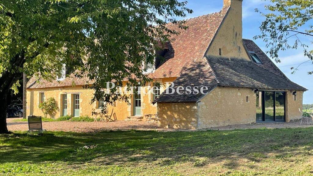 The restored property, a former enclosed plot, lies at the end of a lane beneath a vault of vegetation. The property is hidden, tucked away in the countryside. You enter the property between the main dwelling and an outbuilding. The rectangular house dates back to the 19th century. It offers a floor area of around 200m². It is built of rubble stone, coated with ochre lime rendering. It was recently restored. The outbuildings are built in the same way. Exposed tuffeau stone forms the quoins and door and window surrounds. The gabled roof is covered with old tiles and has three newly created dormers on its south slope. Beside the dwelling, there is a wooden building and another outhouse. The series of buildings forms a courtyard where a tall tree towers in the middle. The garden is enclosed with hedges. The dwelling's facade is its south elevation. Opposite the house there is only a wooden outbuilding that looks out at the surrounding fields.