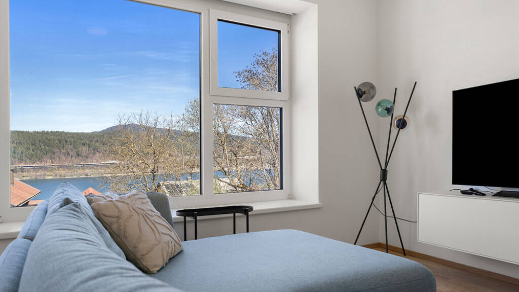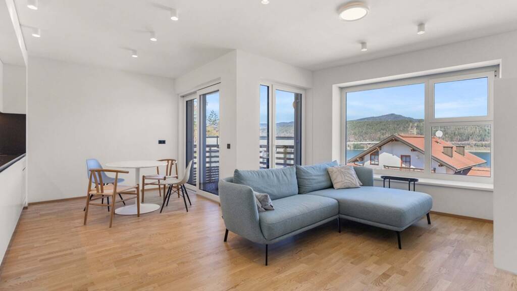 Diese neuwertige Wohnung überzeugt durch ihre hochwertige Ausstattung, durchdachte Raumaufteilung und einen eindrucksvollen Blick auf den Wörthersee. Auf rund 78 m² Wohnfläche bietet die Immobilie ein komfortables Zuhause mit zwei Schlafzimmern und einem großzügigen Wohnbereich. Bereits beim Betreten der Wohnung eröffnet sich ein unvergleichliches Panorama über den See und die umliegende Natur - ein Ausblick, der auch im Wohnbereich stets präsent bleibt und dem Objekt eine besondere Qualität verleiht. Die exklusive Ausstattung umfasst unter anderem eine hochwertige Siematic-Küche sowie ein KNX-basiertes Smart-Home-System, über das Heizung, Beleuchtung und Beschattung komfortabel - auch aus der Ferne - gesteuert werden können. Die Lage verbindet Ruhe mit guter Erreichbarkeit: Das Zentrum von Velden am Wörthersee ist in wenigen Fahrminuten erreichbar, das Strandbad Schiefling befindet sich in kurzer Gehdistanz. Ein Tiefgaragenstellplatz ist im Kaufpreis inkludiert, ein weiterer kann bei Bedarf zusätzlich erworben werden. Diese Wohnung vereint moderne Technik, stilvolle Ausstattung und eine außergewöhnliche Aussicht in einer der begehrtesten Regionen Kärntens.