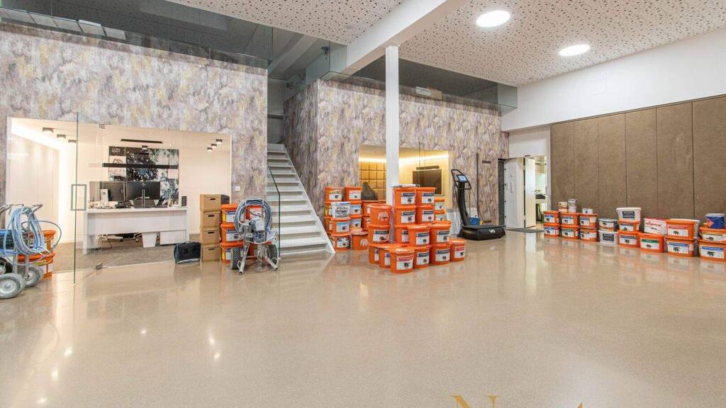 Im Erdgeschoss des Gebäudes gelangt man zunächst in den offenen Empfangsbereich. Von dort aus sind die Büroräumlichkeiten, separate Toiletten und eine Teeküche begehbar. Im hinteren Teil des Objekts befinden sich die unterschiedlichen Lagerräumlichkeiten, weitere moderne Büros, sowie ein Besprechungsraum.