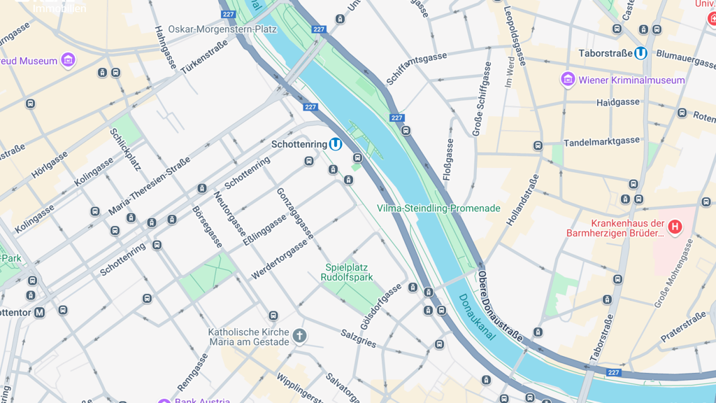 Der Franz-Josefs-Kai liegt mitten in einem der attraktivsten Viertel Wiens. Dank der ausgezeichneten, zentralen Lage sind alle Teile der Stadt vom KAYSER aus einfach und komfortabel erreichbar - so ist die nächste U-Bahn-Station Schottenring" (U4 und U2) sowie "Schwedenplatz" (U1, U4) lediglich wenige Gehminuten entfernt.
