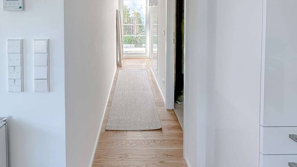 Das Zusammenspiel von hochwertigen Materialien und zeitlosem Design prägt jeden Bereich. Edles Echtholzparkett in den Wohn- und Schlafräumen sorgt für natürliche Wärme, während großformatige Fliesen im Format 30 x 60 cm Eleganz und Modernität vereinen. Eine Fußbodenheizung mit Einzelraumregulierung schenkt Ihnen jederzeit behagliche Wärme, während die Lüftungsanlage mit Wärmerückgewinnung für ein gesundes Raumklima sorgt. Ergänzt wird das stimmige Gesamtbild durch ein zeitloses Schalterprogramm und eine Türsprechstation mit Farb-Bildschirm, die Sicherheit und Komfort auf elegante Weise verbindet.