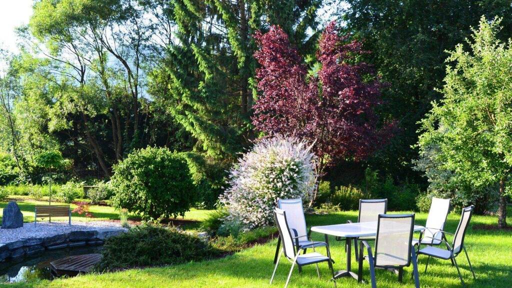 Der Außenbereich ist zweifellos eines der größten Highlights dieser Liegenschaft. Der weitläufige, parkähnliche Garten mit altem Baumbestand, liebevoll angelegten Grünflächen, einem kleinen Teich sowie einem natürlichen Bachlauf vermittelt ein Gefühl von Ruhe und Großzügigkeit.