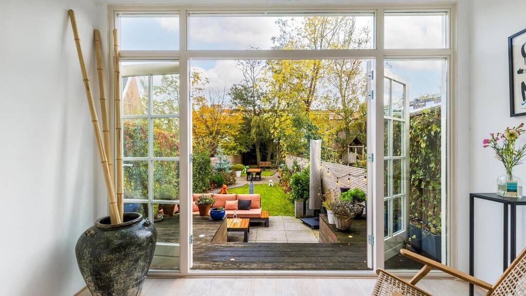 representative entrance with high ceilings and original details. from the hallway, access to the modern guest toilet and the spacious living area with a beautiful oak floor. the open kitchen (renovated in 2022) forms the heart of the home and is equipped with a large cooking island, high-end built-in appliances including a steam oven and a (wine) climate cabinet. adjacent is the bright conservatory with french doors opening onto the sunny rear garden, where indoor and outdoor living blend seamlessly.