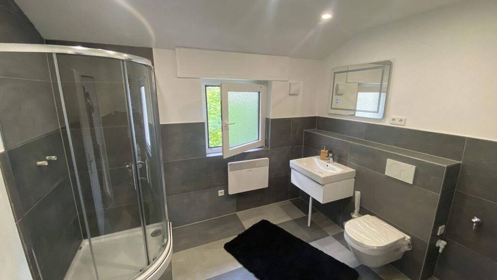 - Großzügigem, modernem Badezimmer mit Blick ins Grüne
