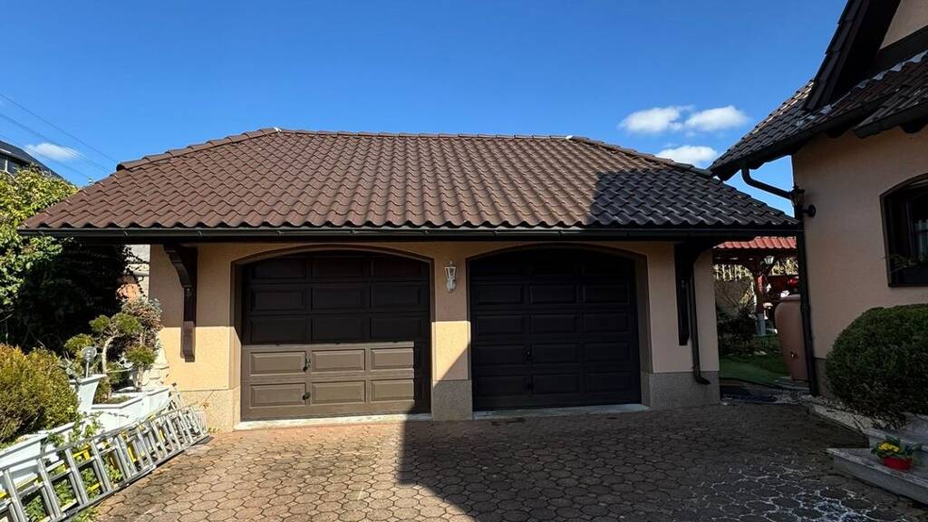 Zu der Immobilie gehören zudem eine Doppelgarage und ein Carport, die ausreichend Platz für Fahrzeuge bieten.
